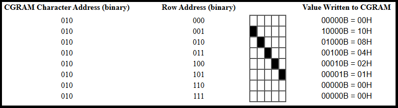 The example above shows how to create the \ symbol in CGRAM location 2. You start by setting CGRAM address to 2, then send the pattern for the character’s first row to CGRAM (in this case, 00H). The AC will automatically increment to point to the next row. You then send the pattern for that row (in this case, 10H), and so on for all eight rows.