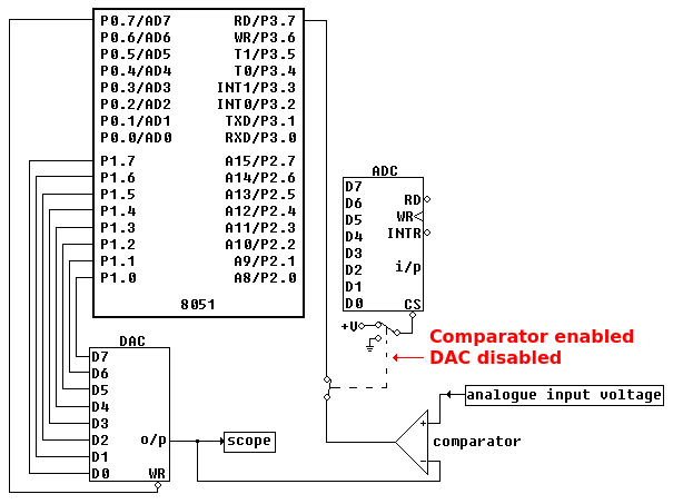 Many lecturers like to get their students to develop their own ADC using a DAC and a comparator. To meet this need, the output of the DAC is also applied to the inverting pin of a comparator, as shown in the logic diagram extract below.
