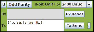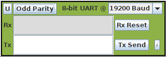 The UART can be set to even parity, odd parity or no parity by clicking on the Parity button, cycling through the three options: No Parity (the default), Odd Parity and Even Parity.