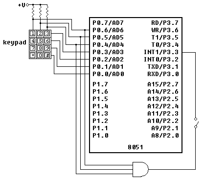 The keypad can be implemented using the external interrupt 1 line (see keypad), but not while also multiplexing the 7-segment displays. This is because the external interrupt 1 line (P3.3) is also used by the display decoder (see logic diagram above). Therefore, keypad interrupt and multiplexing the 7-segment display cannot be used at the same time – the keypad AND gate should be disabled.