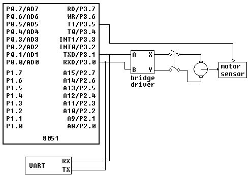 As stated above, the motor control lines share the same port pins as the 8051 serial port RXD and TXD. An external UART is connected to P3.0 and P3.1.