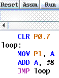 If the code assembles without errors, Assm is replaced by Step, the text area’s background changes to light grey. The code cannot be edited at this point.