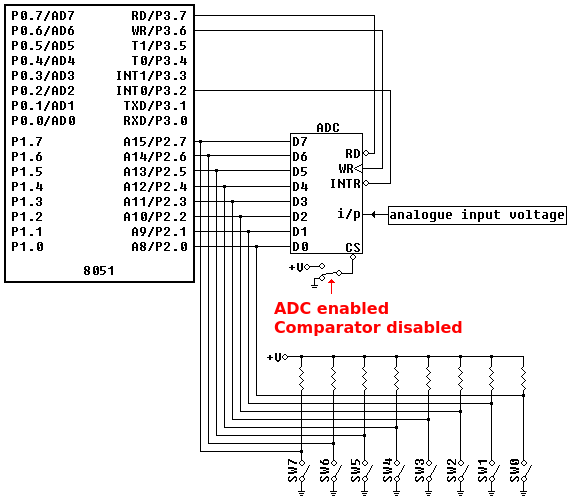 The switch bank and the outputs of the ADC are applied to port 2. Therefore, it should be noted that when the ADC is being used the switches in the switch bank should all be open (in the simulator, the switches are grey when they are closed). If a switch is closed it doesn’t matter what the ADC tries to put on that line, the line is held low because it is connected directly to ground through the closed switch.