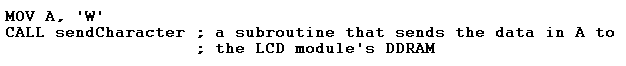 CGRAM stands for character generator RAM. The module’s ROM contains the ASCII character set. For example, the ASCII code for the letter W is 87, so stored in location 87 in the module’s RAM is the pattern for W. This makes it relatively easy to write text to the display. The following code extract illustrates this point: